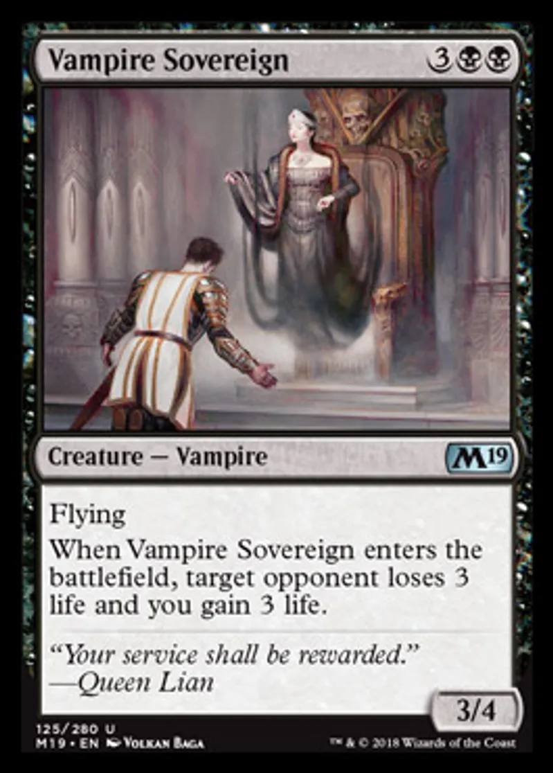 Magic: the Gathering (mtg) Uncommon Creature - Vampire Vampire Sovereign from Core Set 2019 (M19) last updated 2026-02-21 16:53:32