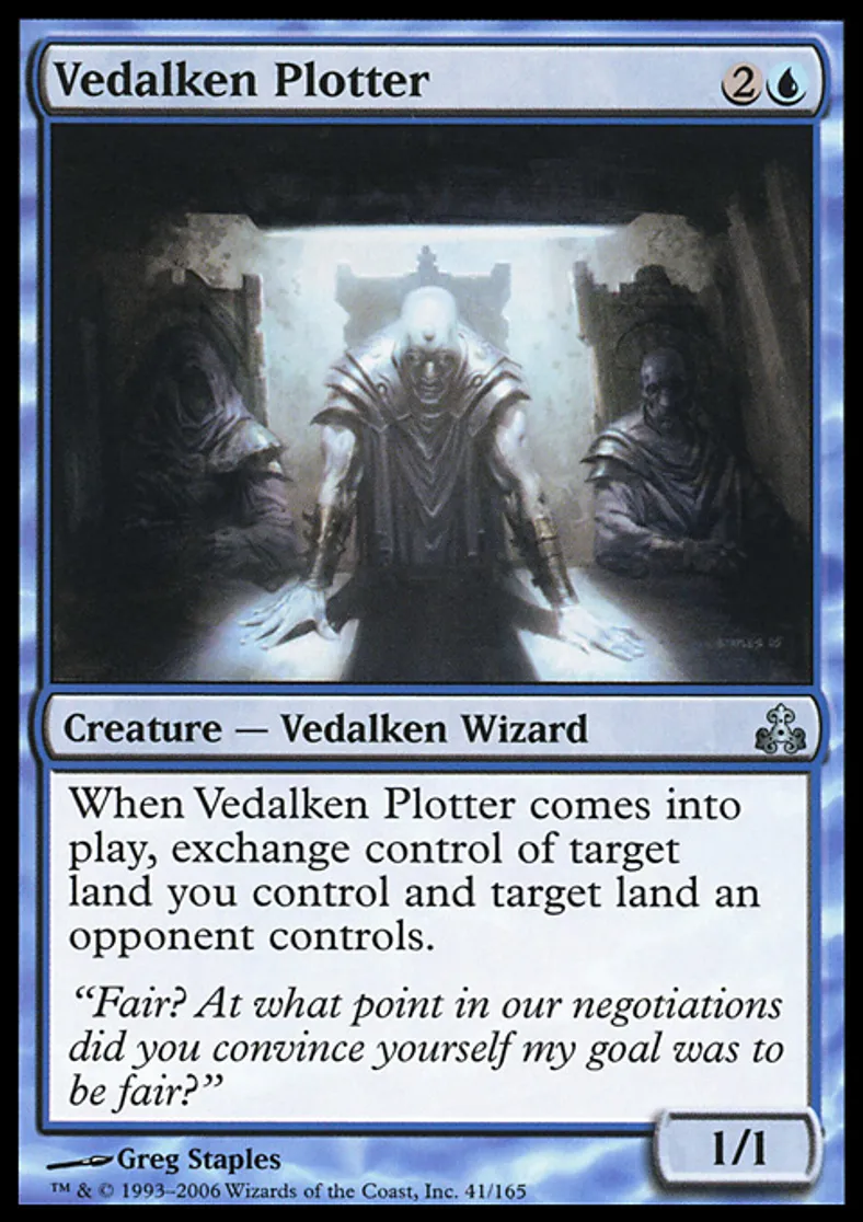 | Oracle Text | When Vedalken Plotter enters the battlefield, exchange control of target land you control and target land an opponent controls. | ||