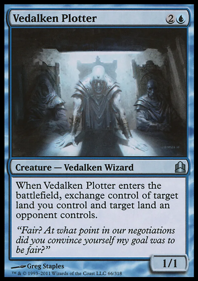| Oracle Text | When Vedalken Plotter enters the battlefield, exchange control of target land you control and target land an opponent controls. | ||