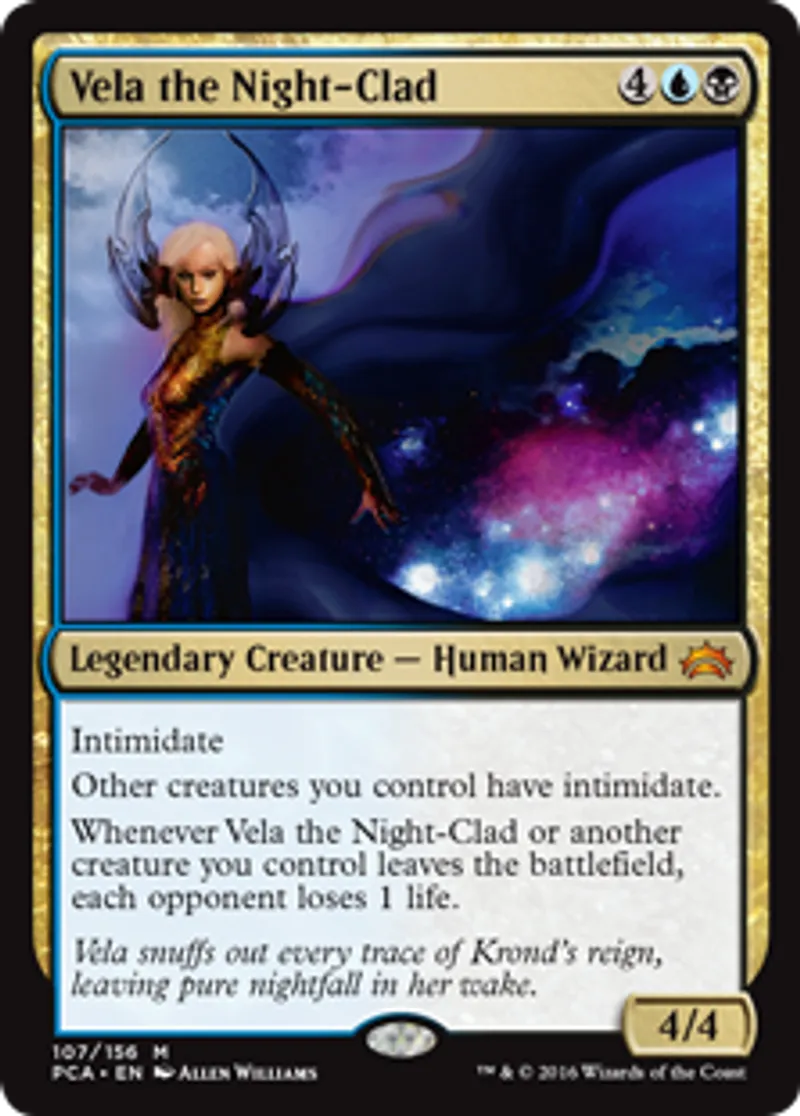 | Oracle Text | Intimidate (This creature can't be blocked except by artifact creatures and/or creatures that share a color with it.) Other creatures you control have intimidate. Whenever Vela the Night-Clad or another creature you control leaves the battlefield, each opponent loses 1 life. | ||