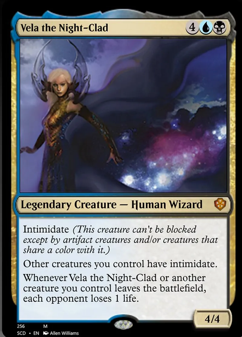 Magic: the Gathering (mtg) mythic Legendary Creature — Human Wizard Vela the Night-Clad from Starter Commander Decks (scd) last updated 2026-01-31 16:52:03