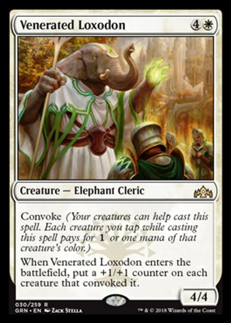 | Oracle Text | Convoke (Your creatures can help cast this spell. Each creature you tap while casting this spell pays for {{1}} or one mana of that creature's color.) When Venerated Loxodon enters the battlefield, put a +1/+1 counter on each creature that convoked it. | ||