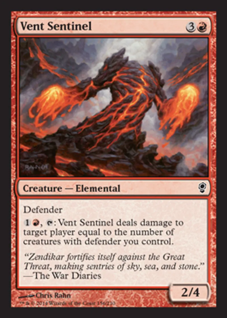 | Oracle Text | Defender {{1}}{{r}}, {{t}}: Vent Sentinel deals damage to target player equal to the number of creatures with defender you control. | ||