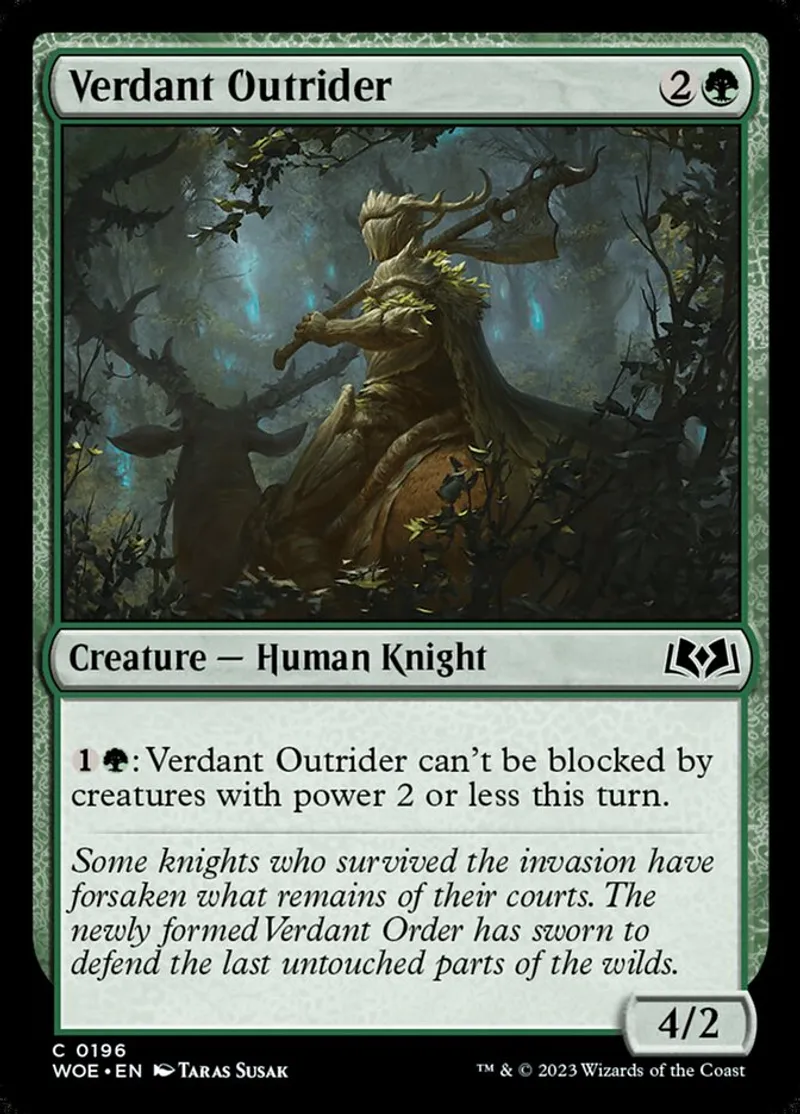 Verdant Outrider is a common in the set Wilds of Eldraine.