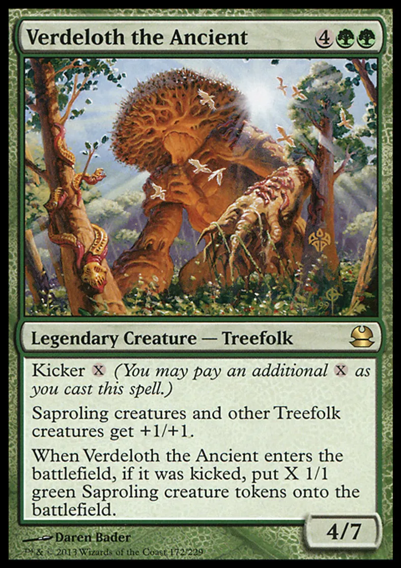 | Oracle Text | Kicker {{x}} (You may pay an additional {{x}} as you cast this spell.) Saproling creatures and other Treefolk creatures get +1/+1. When Verdeloth the Ancient enters the battlefield, if it was kicked, put X 1/1 green Saproling creature tokens onto the battlefield. | ||
