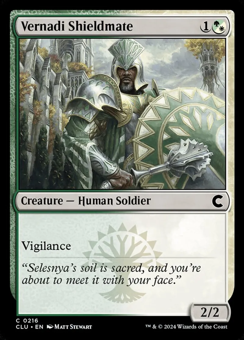 Magic: the Gathering (mtg) common Creature — Human Soldier Vernadi Shieldmate from Ravnica: Clue Edition (clu) last updated 2026-02-21 15:56:32