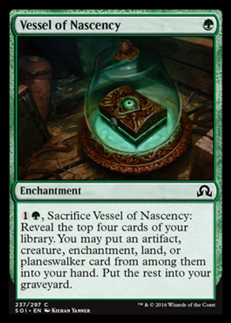 | Oracle Text | {{1}}{{g}}, Sacrifice Vessel of Nascency: Reveal the top four cards of your library. You may put an artifact, creature, enchantment, land, or planeswalker card from among them into your hand. Put the rest into your graveyard. | ||