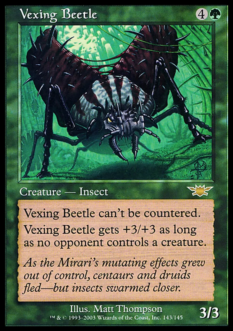 | Oracle Text | Vexing Beetle can't be countered. Vexing Beetle gets +3/+3 as long as no opponent controls a creature. | ||