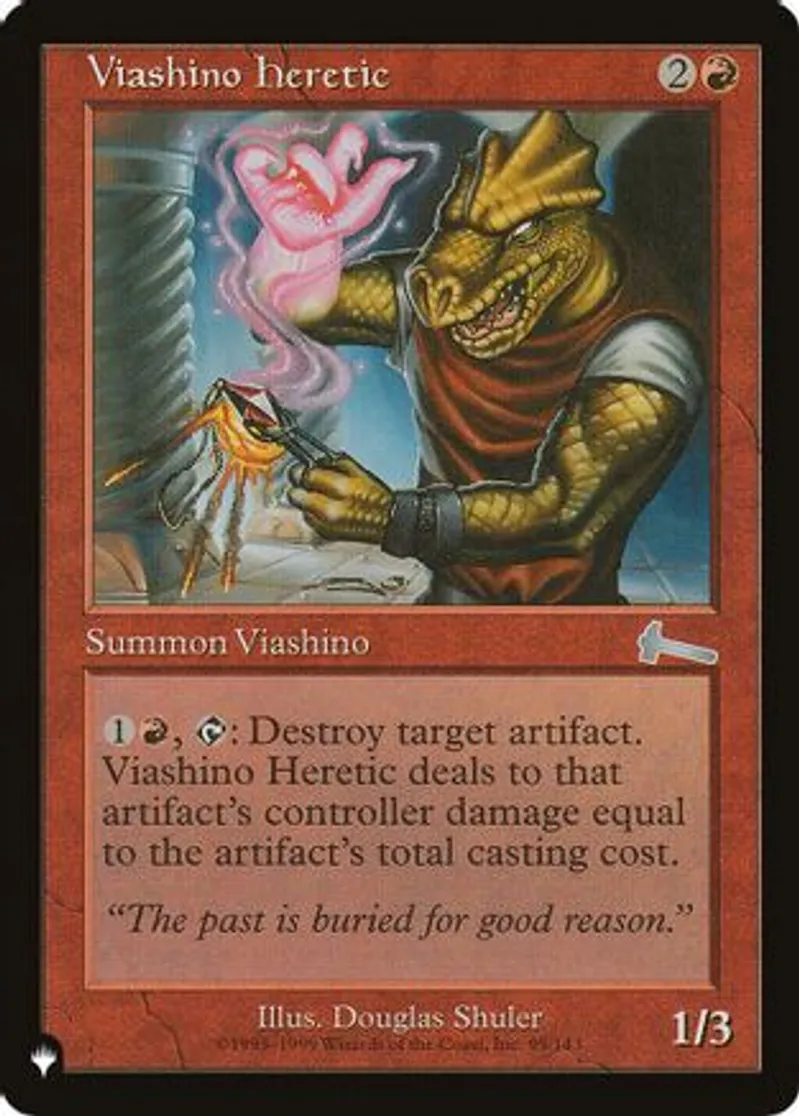 | Oracle Text | {{1}}{{r}}, {{t}}: Destroy target artifact. Viashino Heretic deals to that artifact’s controller damage equal to the artifact’s total casting cost. | ||