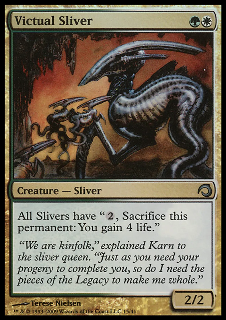 | Flavor Text | "We are kinfolk," explained Karn to the sliver queen. "Just as you need your progeny to complete you, so do I need the pieces of the Legacy to make me whole." | ||