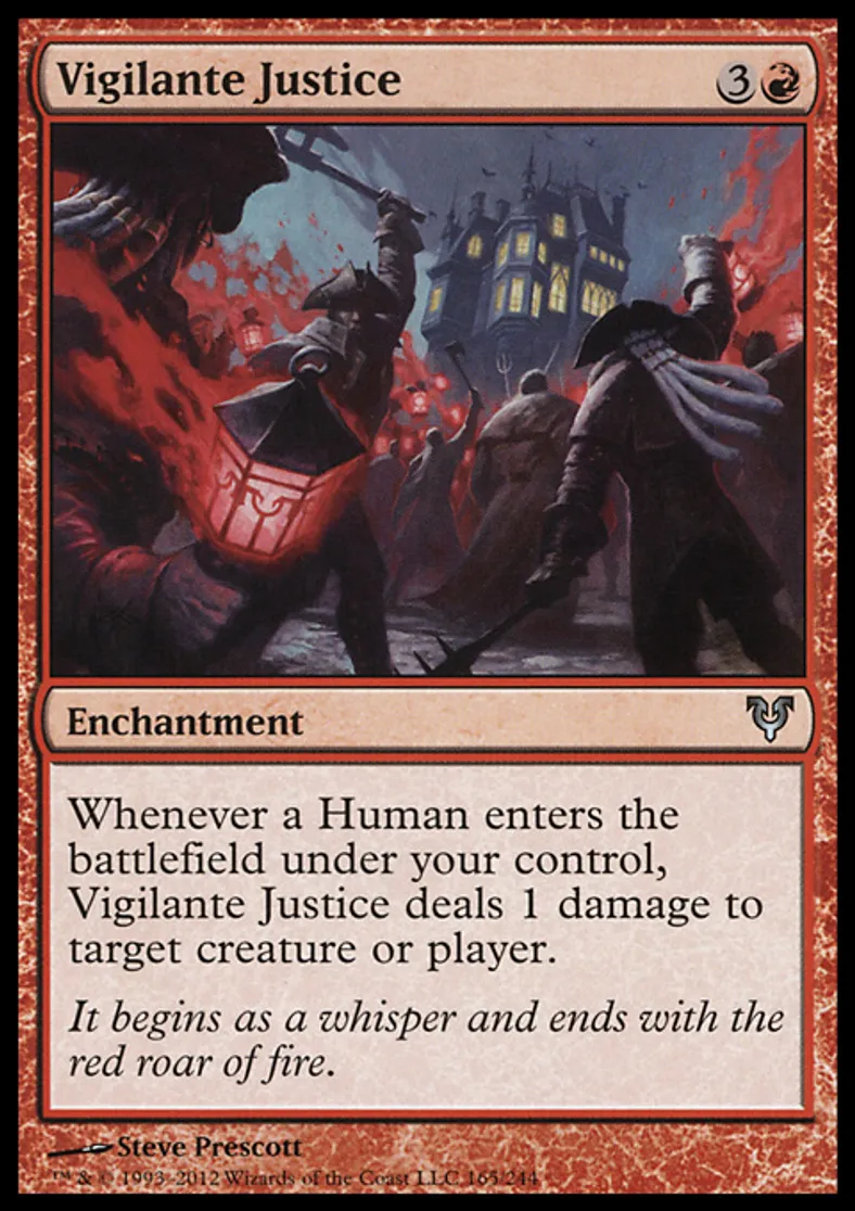 | Oracle Text | Whenever a Human enters the battlefield under your control, Vigilante Justice deals 1 damage to target creature or player. | ||