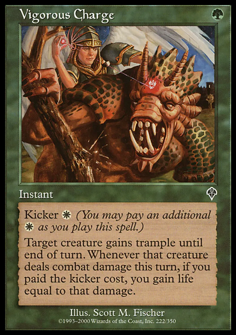 | Oracle Text | Kicker {{w}} (You may pay an additional {{w}} as you cast this spell.) Target creature gains trample until end of turn. Whenever that creature deals combat damage this turn, if Vigorous Charge was kicked, you gain life equal to that damage. | ||