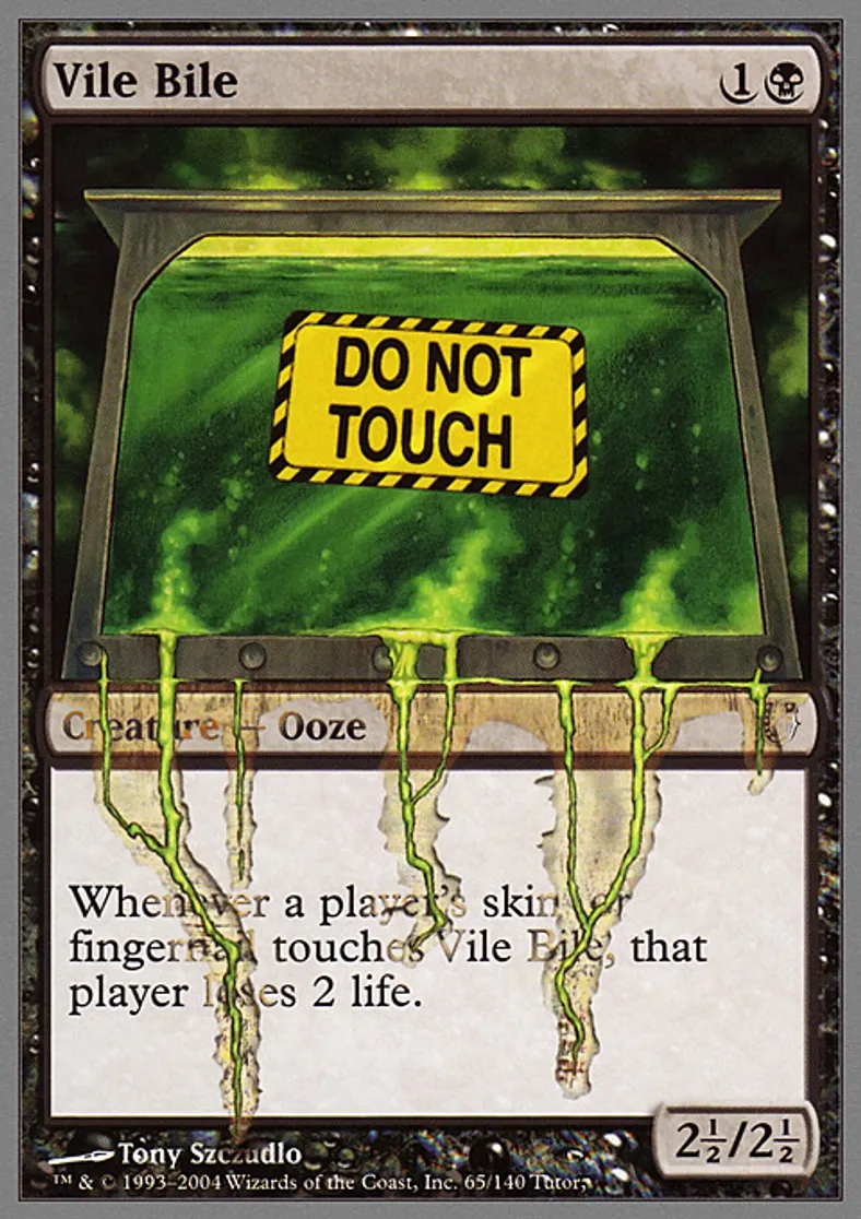| Oracle Text | Whenever a player's skin or fingernail touches Vile Bile, that player loses 2 life. | ||