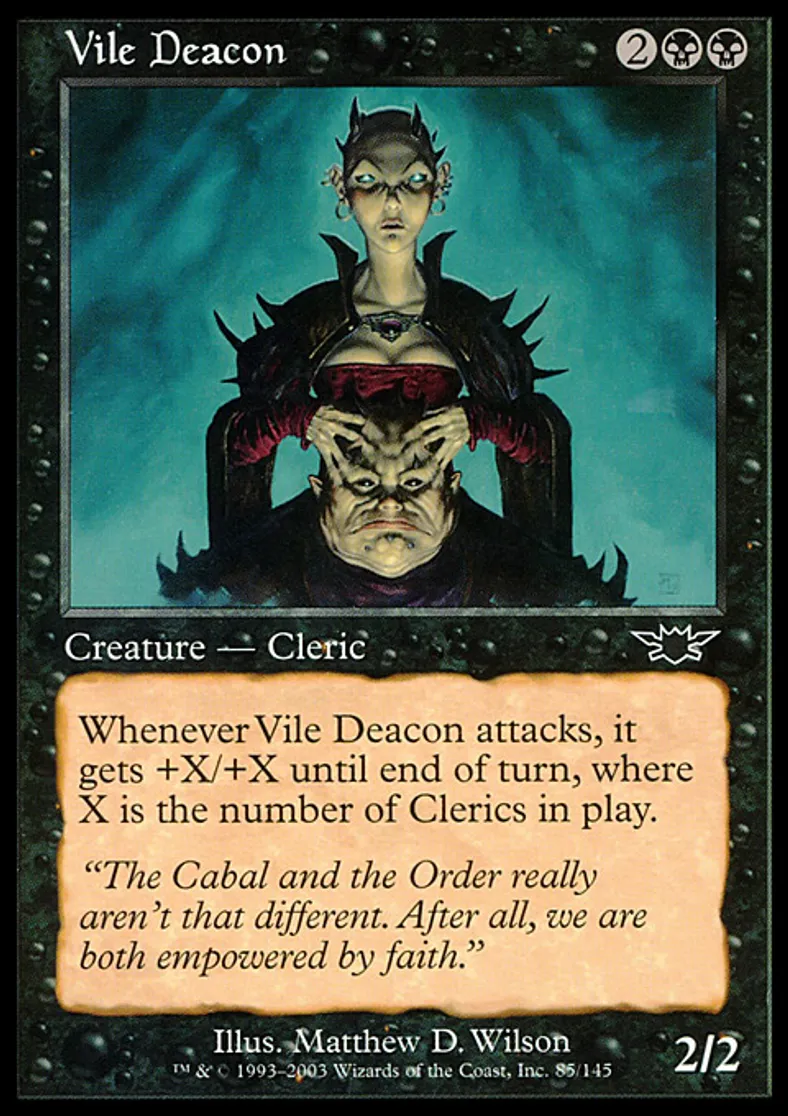 | Oracle Text | Whenever Vile Deacon attacks, it gets +X/+X until end of turn, where X is the number of Clerics on the battlefield. | ||
