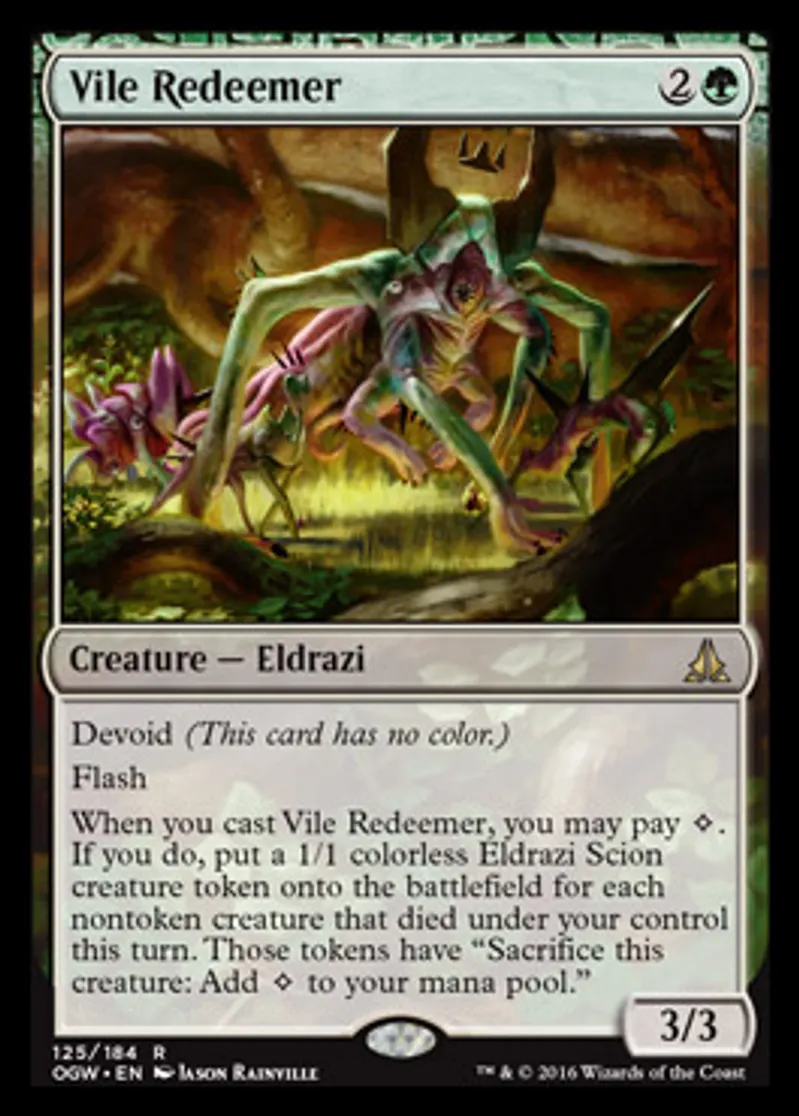 | Oracle Text | Devoid (This card has no color.) Flash When you cast Vile Redeemer, you may pay {{Colorless}}. If you do, put a 1/1 colorless Eldrazi Scion creature token onto the battlefield for each nontoken creature that died under your control this turn. Those tokens have "Sacrifice this creature: Add {{Colorless}} to your mana pool." | ||