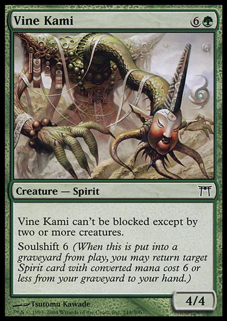 | Oracle Text | Vine Kami can't be blocked except by two or more creatures. Soulshift 6 (When this creature dies, you may return target Spirit card with converted mana cost 6 or less from your graveyard to your hand.) | ||
