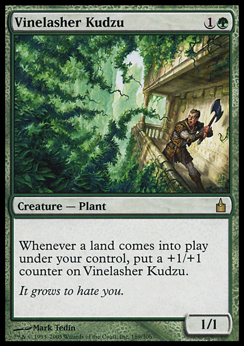 | Oracle Text | Whenever a land enters the battlefield under your control, put a +1/+1 counter on Vinelasher Kudzu. | ||