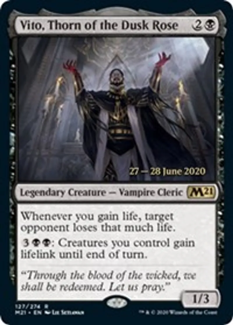 Magic: the Gathering (mtg) Rare Legendary Creature — Vampire Cleric Vito, Thorn of the Dusk Rose from Prerelease Cards (pPRE) last updated 2026-02-24 15:28:36