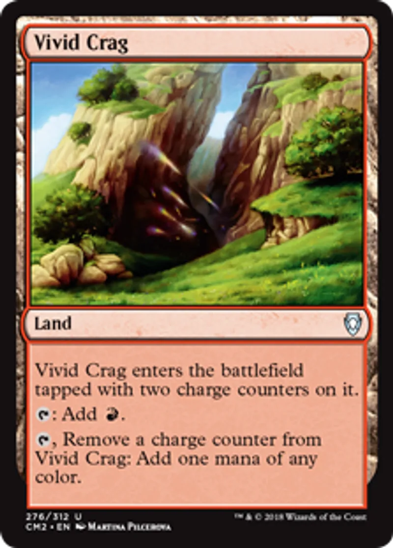 | Oracle Text | Vivid Crag enters the battlefield tapped with two charge counters on it. {{t}}: Add {{r}}. {{t}}, Remove a charge counter from Vivid Crag: Add one mana of any color. | ||