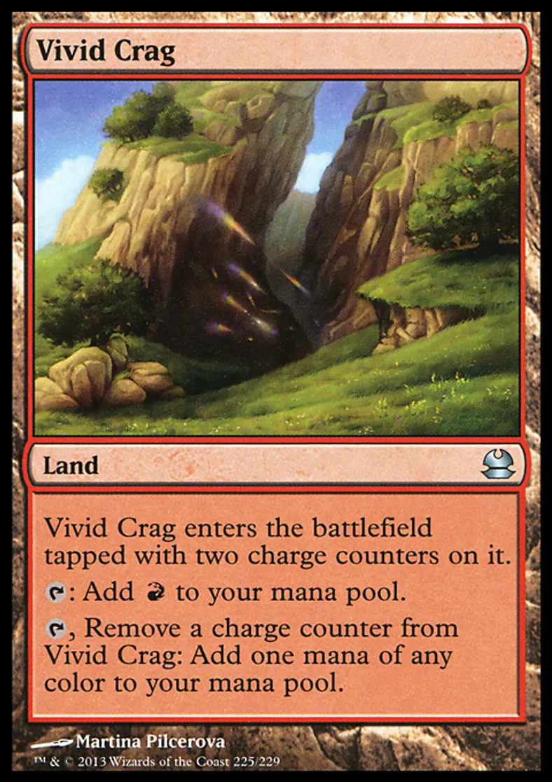 | Oracle Text | Vivid Crag enters the battlefield tapped with two charge counters on it. {{t}}: Add {{r}} to your mana pool. {{t}}, Remove a charge counter from Vivid Crag: Add one mana of any color to your mana pool. | ||