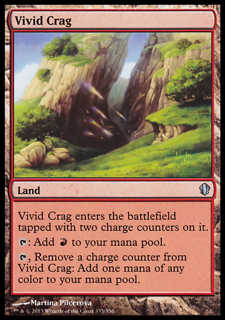 | Oracle Text | Vivid Crag enters the battlefield tapped with two charge counters on it. {{t}}: Add {{r}} to your mana pool. {{t}}, Remove a charge counter from Vivid Crag: Add one mana of any color to your mana pool. | ||