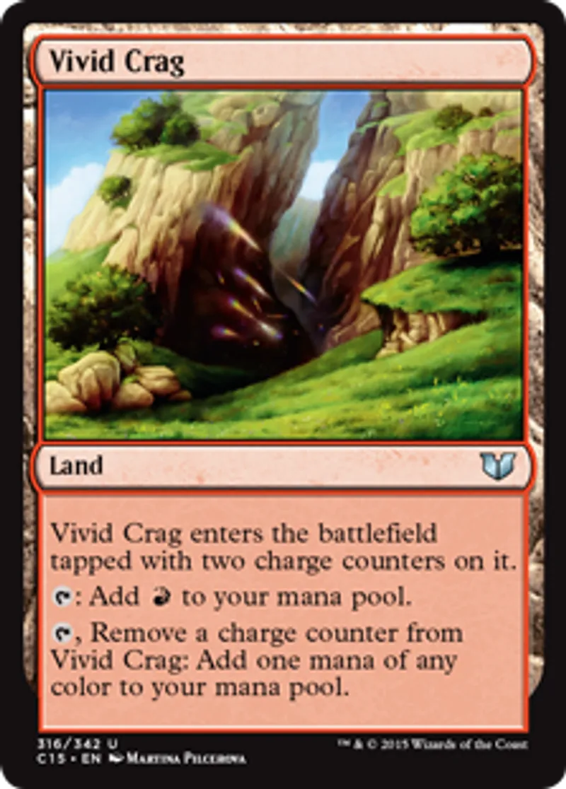 | Oracle Text | Vivid Crag enters the battlefield tapped with two charge counters on it. {{t}}: Add {{r}} to your mana pool. {{t}}, Remove a charge counter from Vivid Crag: Add one mana of any color to your mana pool. | ||