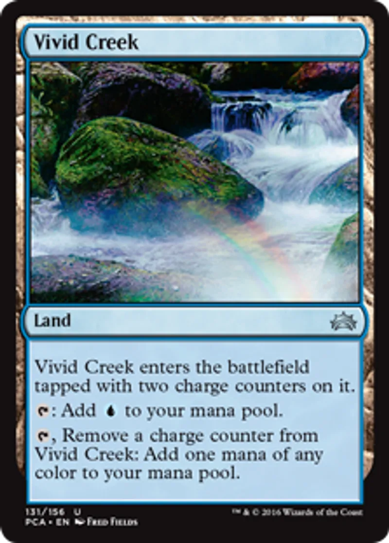 | Oracle Text | Vivid Creek enters the battlefield tapped with two charge counters on it. {{t}}: Add {{u}} to your mana pool. {{t}}, Remove a charge counter from Vivid Creek: Add one mana of any color to your mana pool. | ||