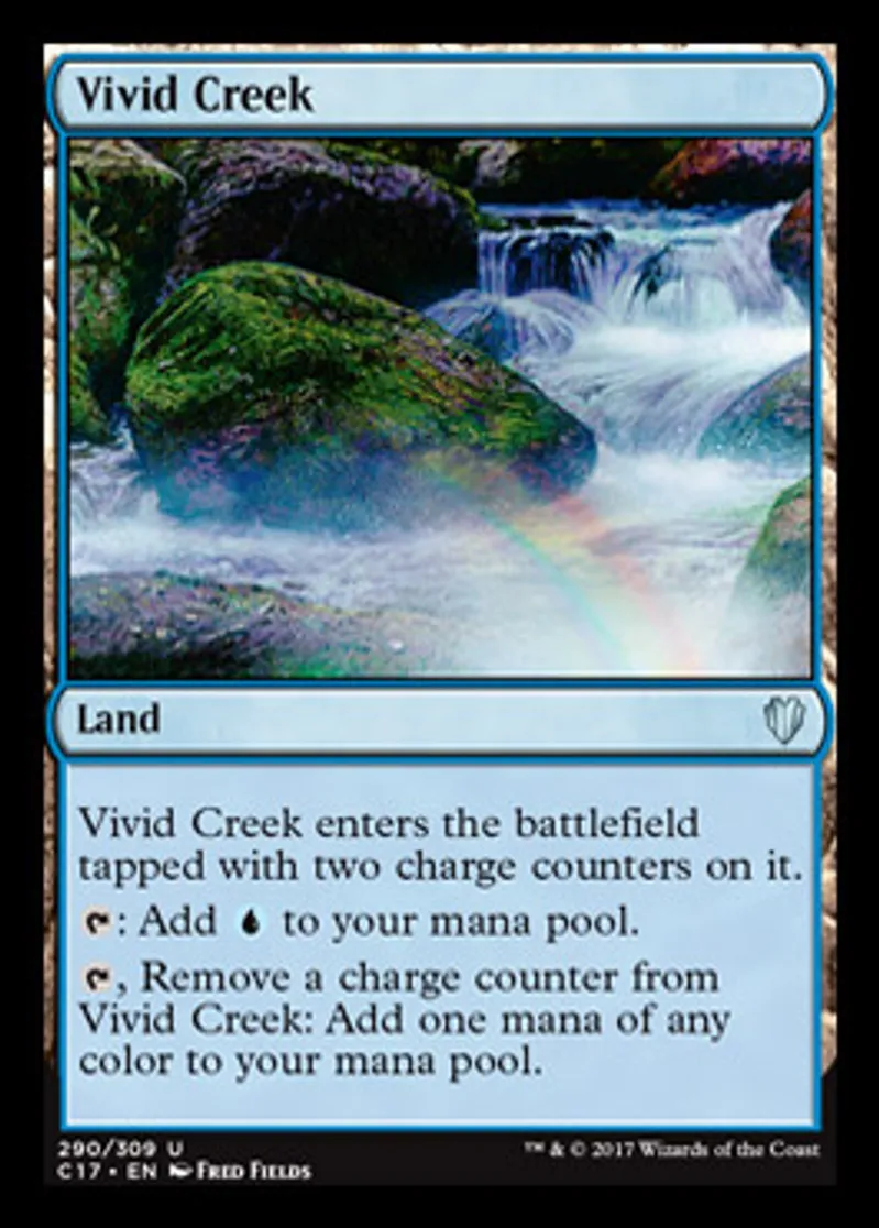 | Oracle Text | Vivid Creek enters the battlefield tapped with two charge counters on it. {{t}}: Add {{u}} to your mana pool. {{t}}, Remove a charge counter from Vivid Creek: Add one mana of any color to your mana pool. | ||