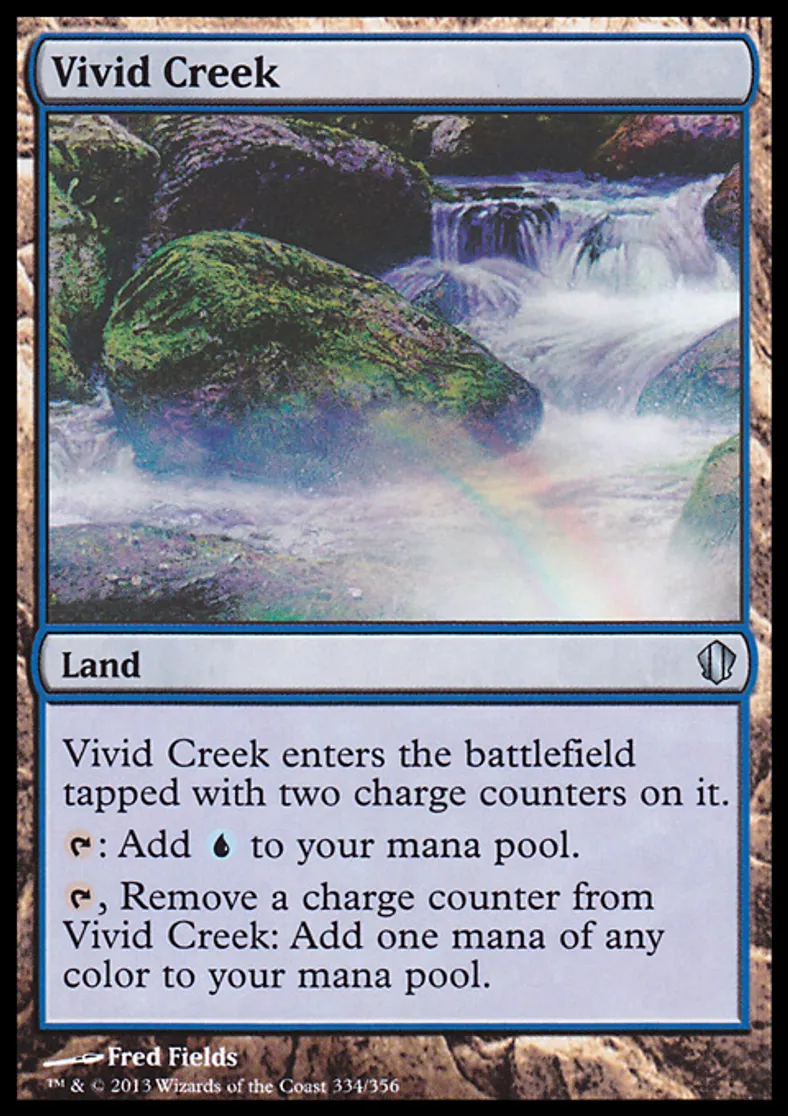 | Oracle Text | Vivid Creek enters the battlefield tapped with two charge counters on it. {{t}}: Add {{u}} to your mana pool. {{t}}, Remove a charge counter from Vivid Creek: Add one mana of any color to your mana pool. | ||