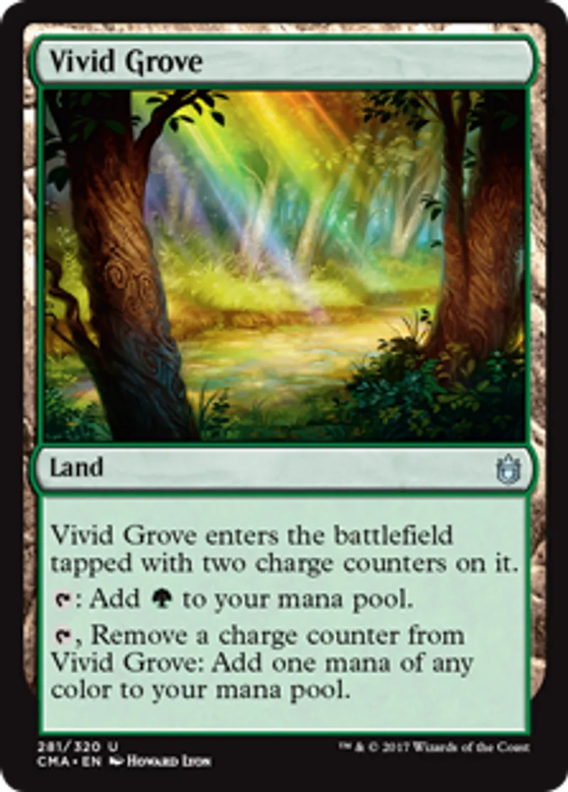 | Oracle Text | Vivid Grove enters the battlefield tapped with two charge counters on it. {{t}}: Add {{g}} to your mana pool. {{t}}, Remove a charge counter from Vivid Grove: Add one mana of any color to your mana pool. | ||