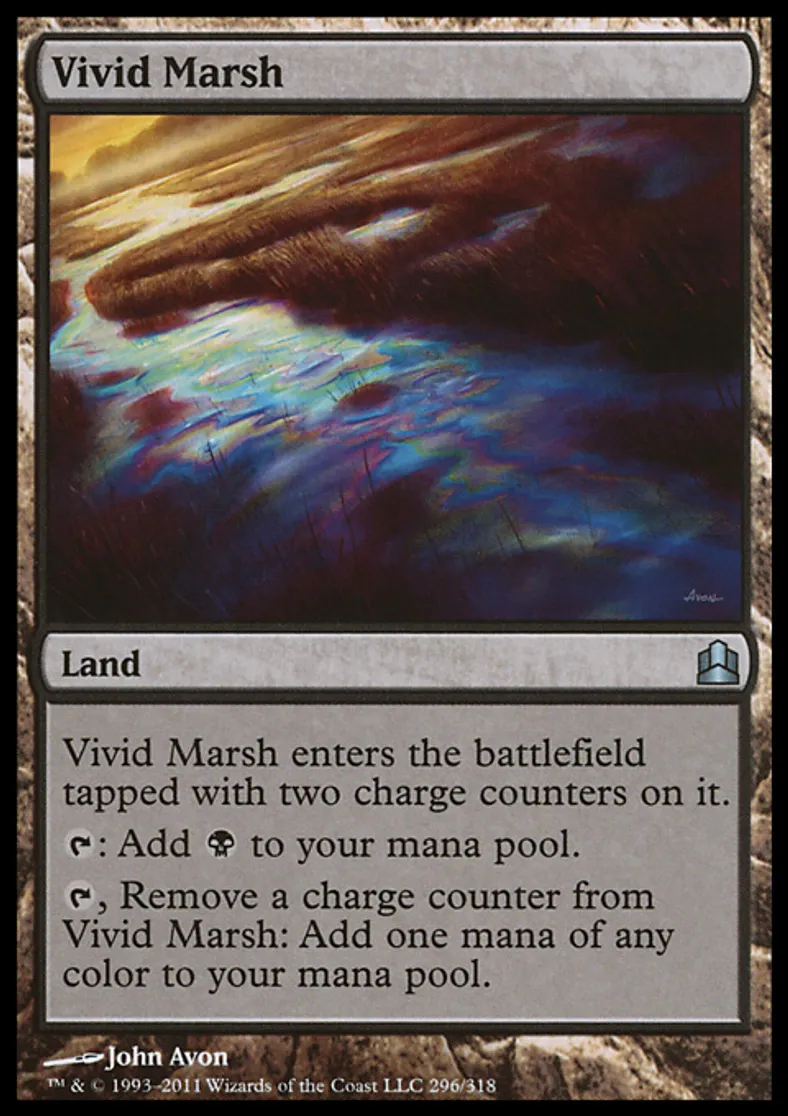 | Oracle Text | Vivid Marsh enters the battlefield tapped with two charge counters on it. {{t}}: Add {{b}} to your mana pool. {{t}}, Remove a charge counter from Vivid Marsh: Add one mana of any color to your mana pool. | ||