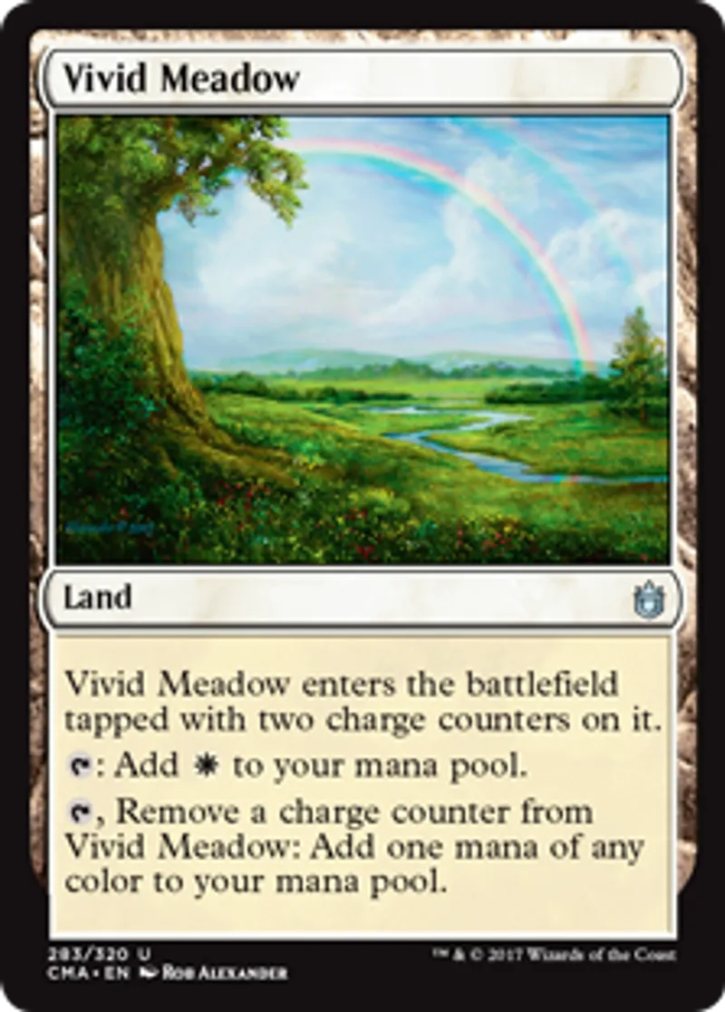 | Oracle Text | Vivid Meadow enters the battlefield tapped with two charge counters on it. {{t}}: Add {{w}} to your mana pool. {{t}}, Remove a charge counter from Vivid Meadow: Add one mana of any color to your mana pool. | ||