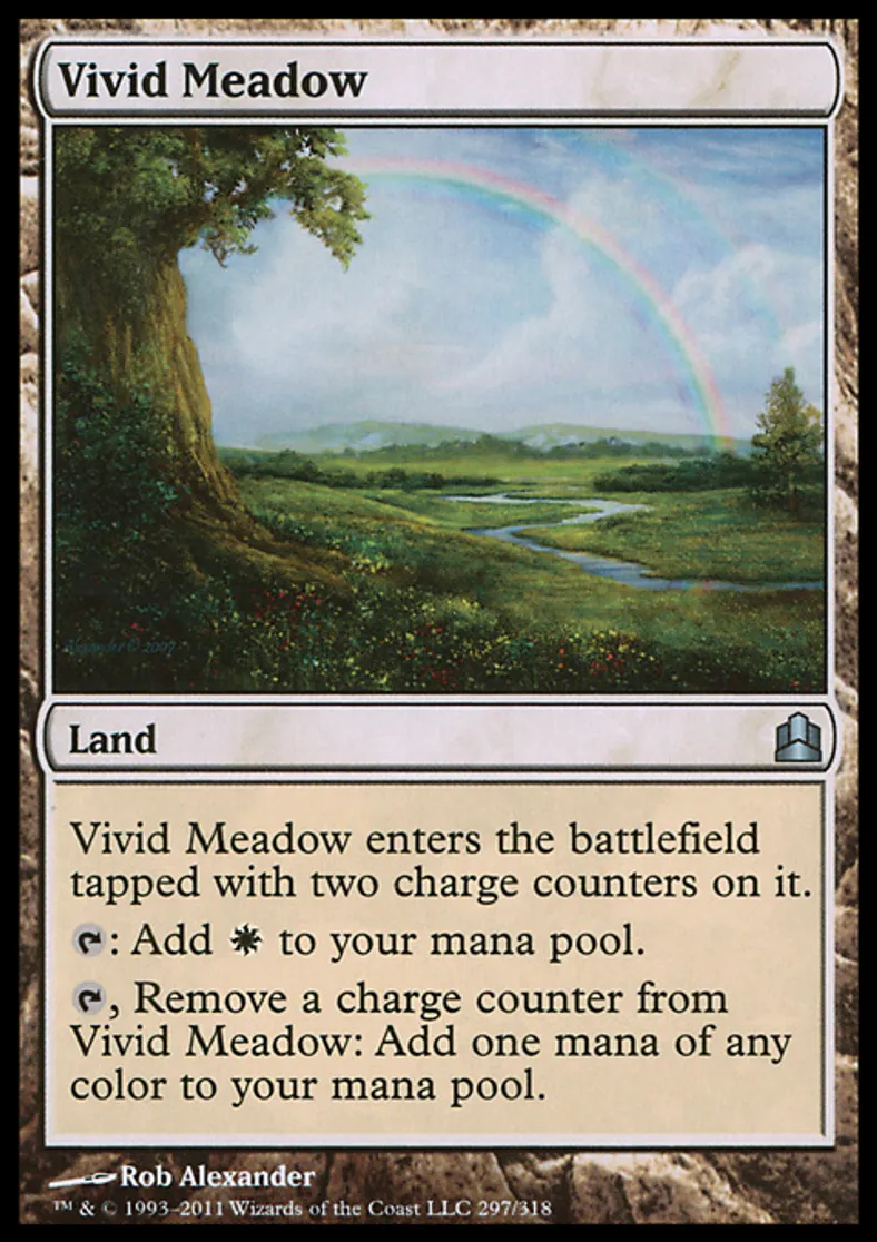 | Oracle Text | Vivid Meadow enters the battlefield tapped with two charge counters on it. {{t}}: Add {{w}} to your mana pool. {{t}}, Remove a charge counter from Vivid Meadow: Add one mana of any color to your mana pool. | ||