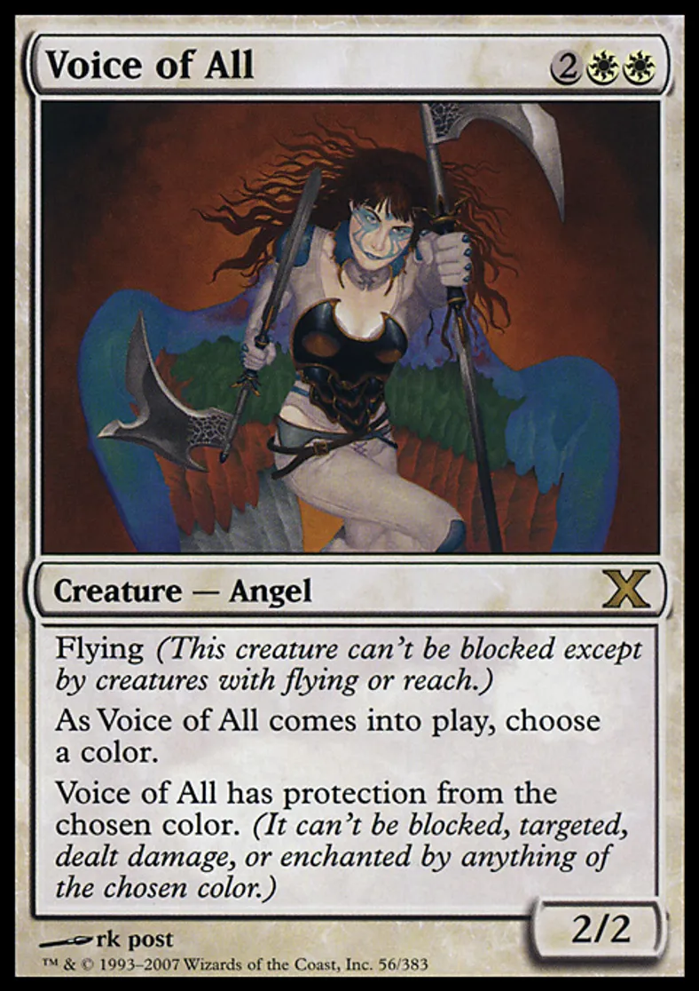 | Oracle Text | Flying As Voice of All enters the battlefield, choose a color. Voice of All has protection from the chosen color. | ||