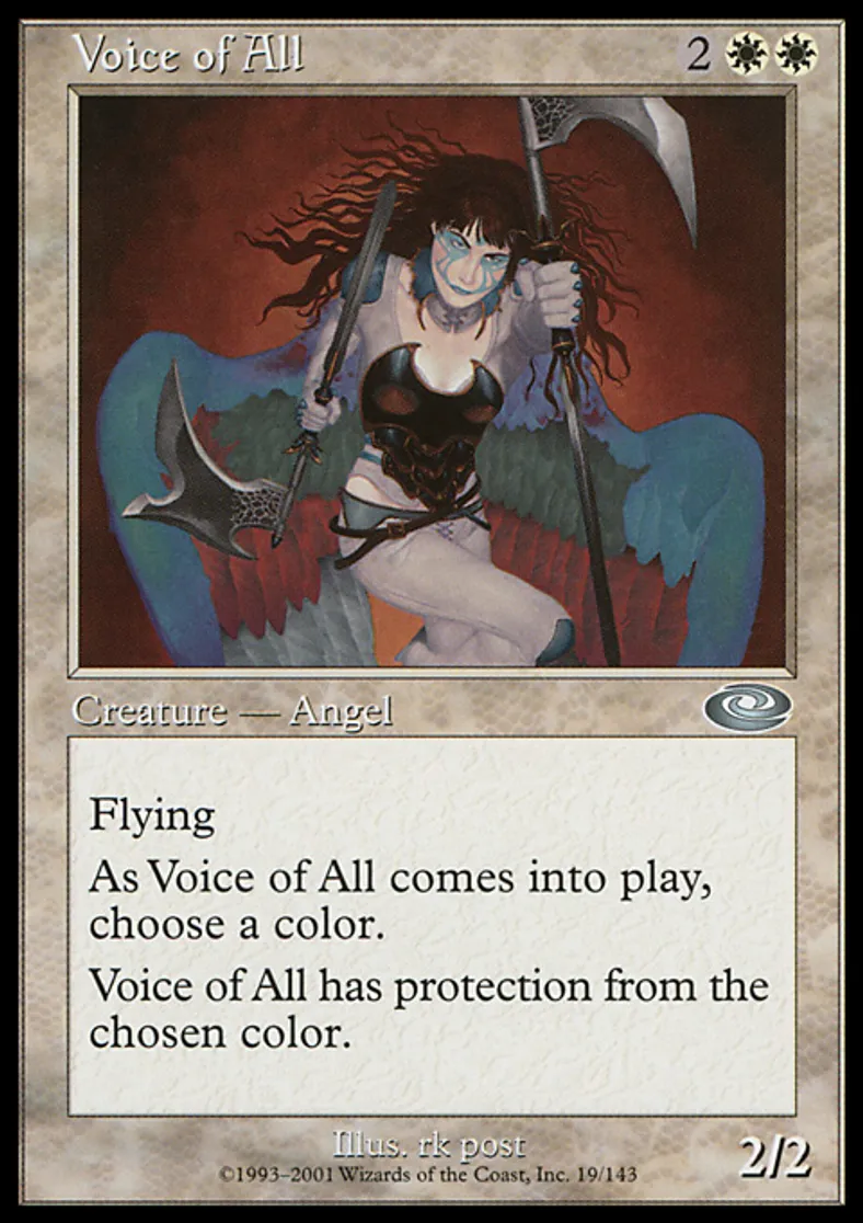| Oracle Text | Flying As Voice of All enters the battlefield, choose a color. Voice of All has protection from the chosen color. | ||