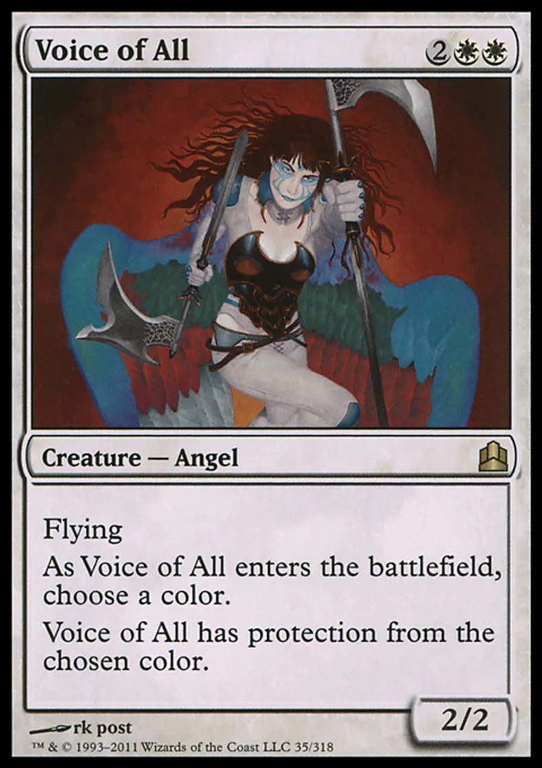 | Oracle Text | Flying As Voice of All enters the battlefield, choose a color. Voice of All has protection from the chosen color. | ||