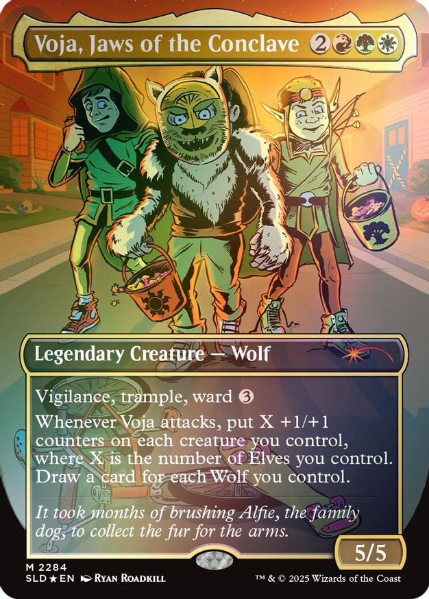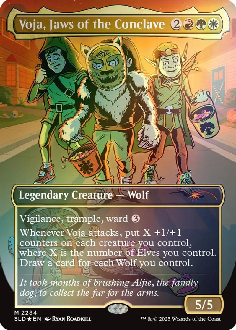 | Oracle Text | trick or treat vigilance, trample, ward 3 whenever voja attacks, put x +1/+1 counters on each creature you control, where x is the number of elves you control. draw a card for each wolf you control. when purchasing this unique product, please keep in mind that this card only appears in the secret lair drop: trick or treat and will ship out to you after the seller receives the product directly from wizards of the coast.the estimated time frame for sellers to receive stock is not fixed, so it could be anywhere between 1 - 10 weeks for delivery. | ||