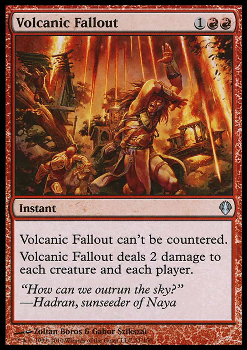 | Oracle Text | Volcanic Fallout can't be countered. Volcanic Fallout deals 2 damage to each creature and each player. | ||
