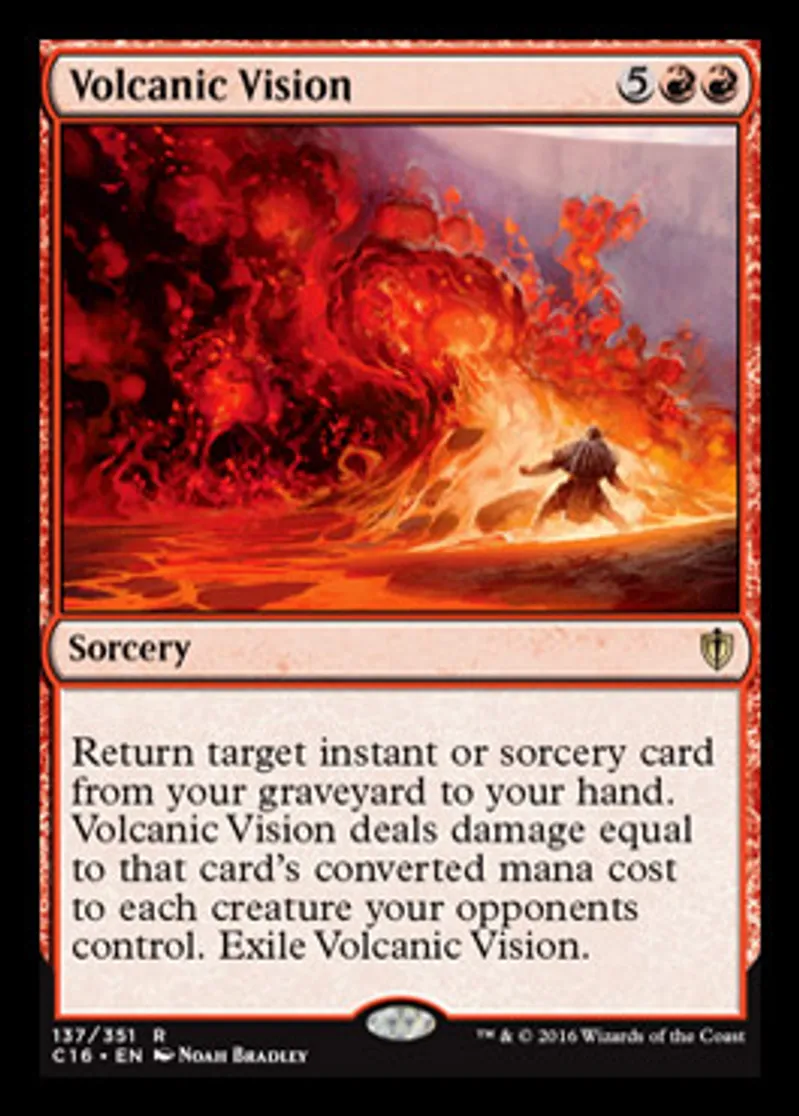 | Oracle Text | Return target instant or sorcery card from your graveyard to your hand. Volcanic Vision deals damage equal to that card's converted mana cost to each creature your opponents control. Exile Volcanic Vision. | ||