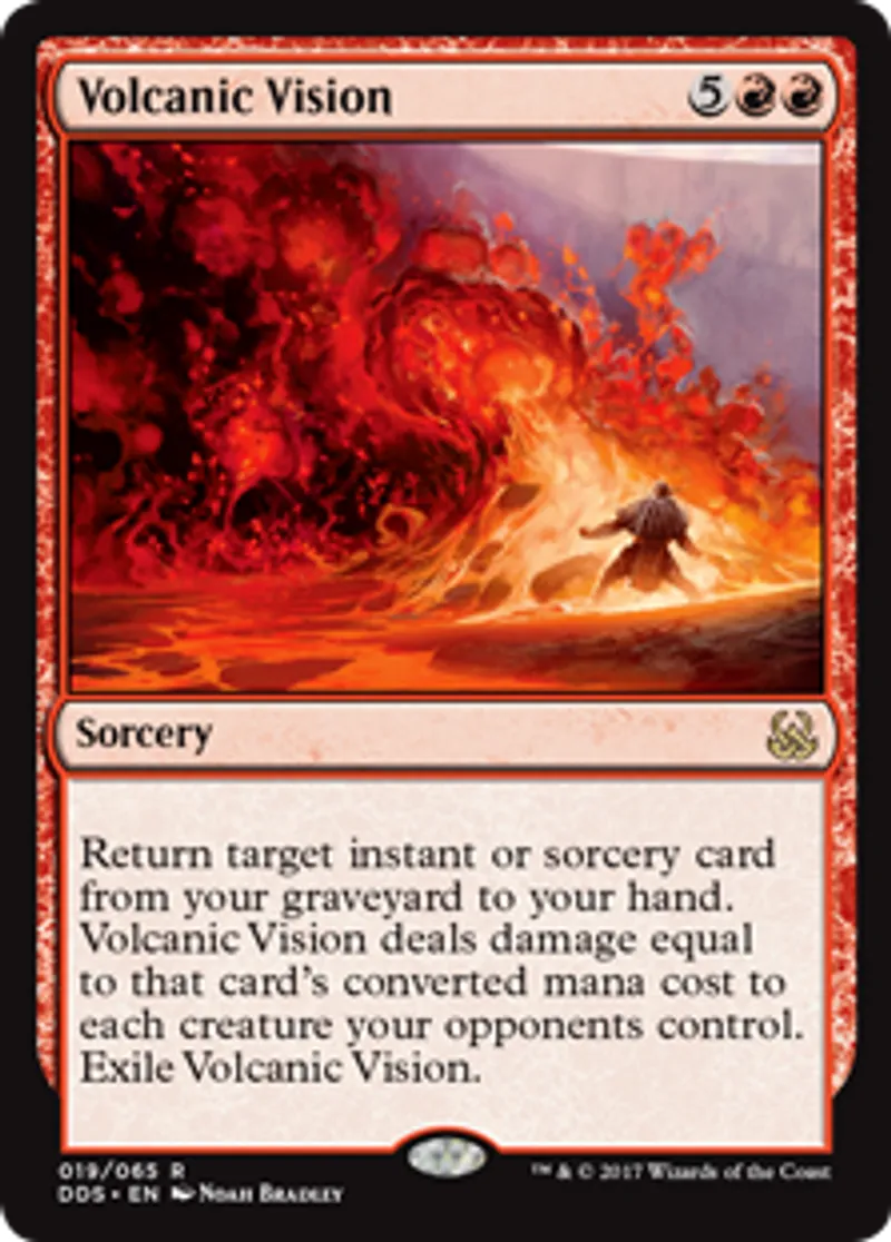 | Oracle Text | Return target instant or sorcery card from your graveyard to your hand. Volcanic Vision deals damage equal to that card's converted mana cost to each creature your opponents control. Exile Volcanic Vision. | ||