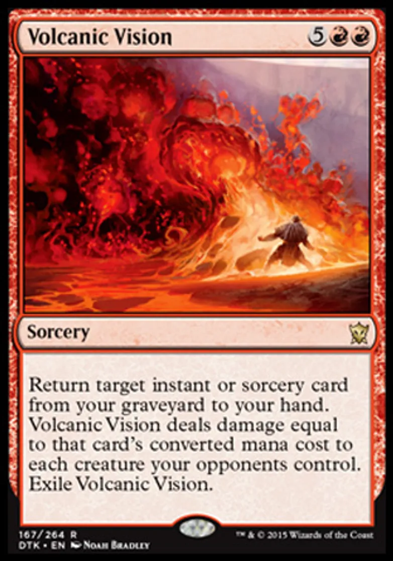 | Oracle Text | Return target instant or sorcery card from your graveyard to your hand. Volcanic Vision deals damage equal to that card's converted mana cost to each creature your opponents control. Exile Volcanic Vision. | ||