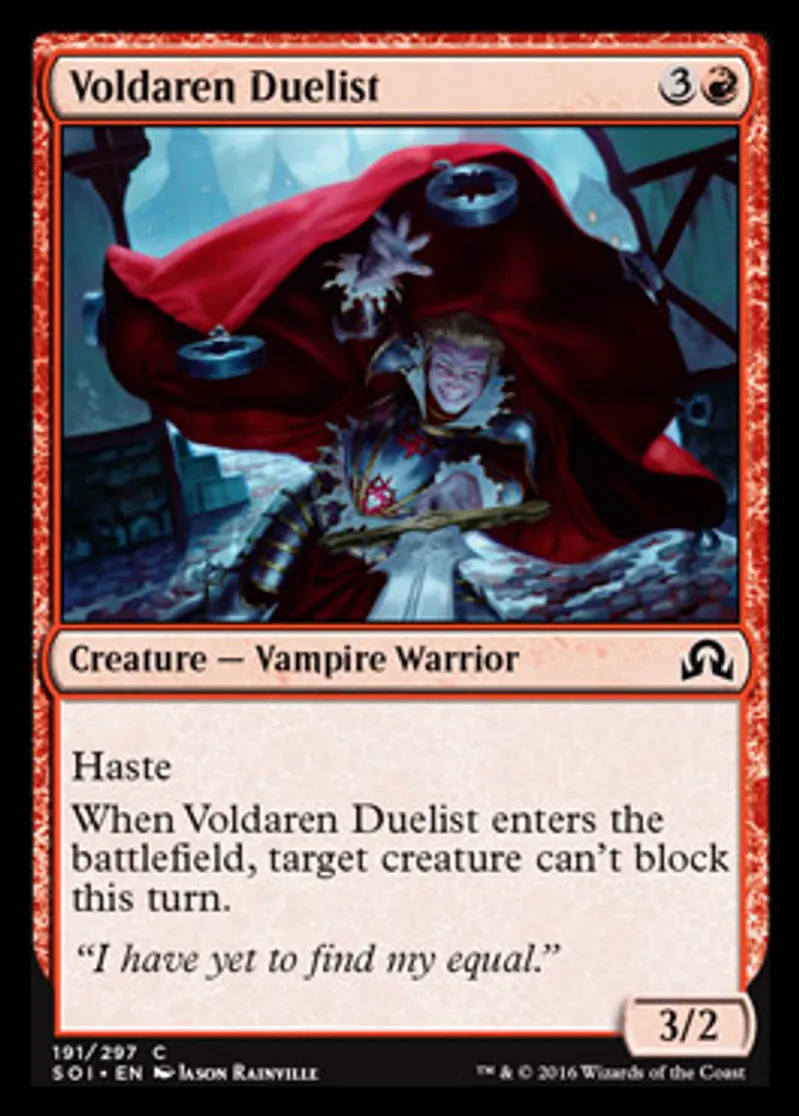 | Oracle Text | Haste When Voldaren Duelist enters the battlefield, target creature can't block this turn. | ||