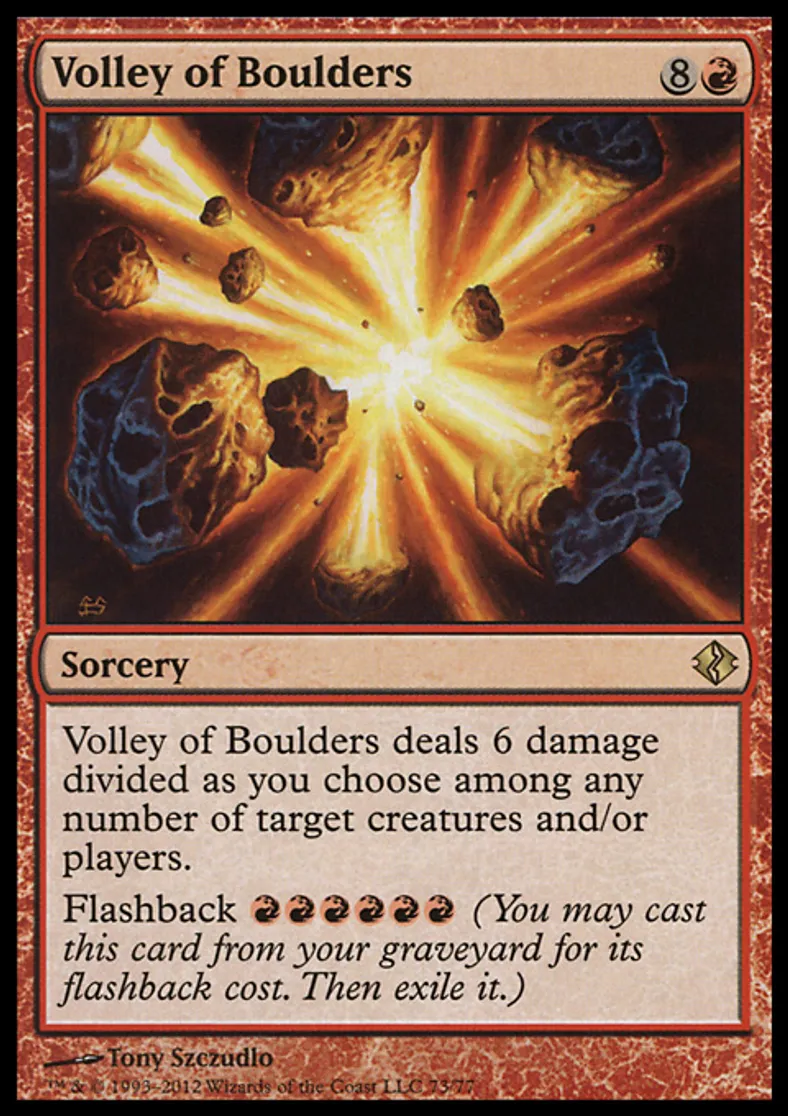 | Oracle Text | Volley of Boulders deals 6 damage divided as you choose among any number of target creatures and/or players. Flashback {{r}}{{r}}{{r}}{{r}}{{r}}{{r}} (You may cast this card from your graveyard for its flashback cost. Then exile it.) | ||
