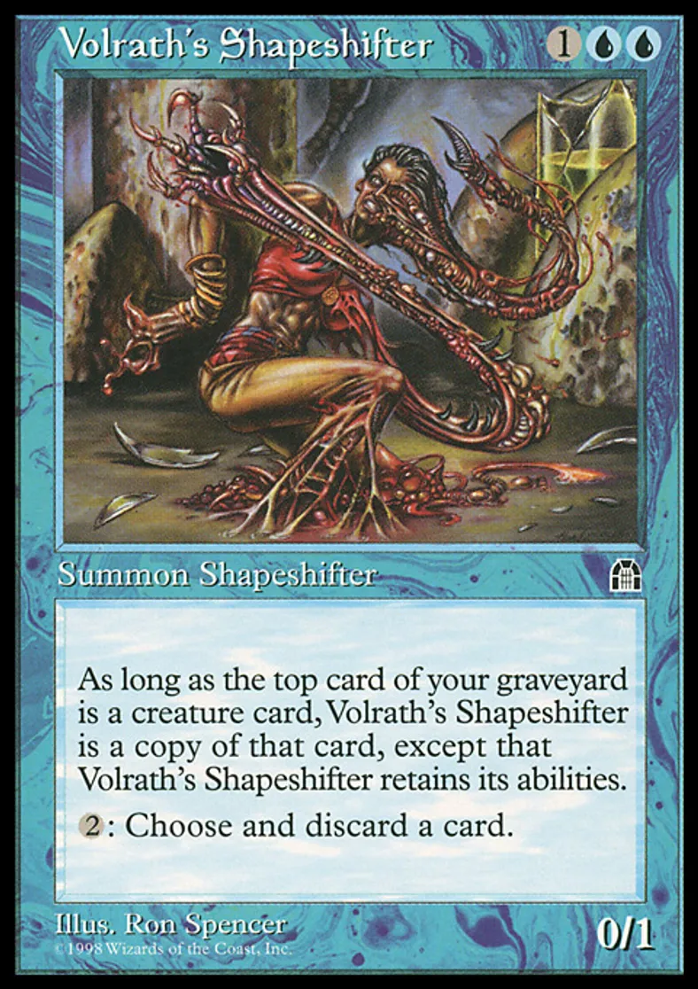 | Oracle Text | As long as the top card of your graveyard is a creature card, Volrath's Shapeshifter has the full text of that card and has the text "{{2}}: Discard a card." (Volrath's Shapeshifter has that card's name, mana cost, color, types, abilities, power, and toughness.) {{2}}: Discard a card. | ||