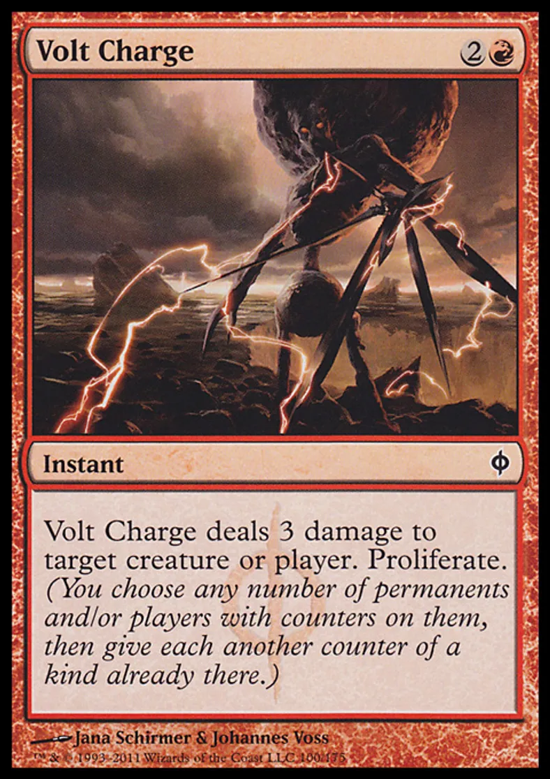| Oracle Text | Volt Charge deals 3 damage to target creature or player. Proliferate. (You choose any number of permanents and/or players with counters on them, then give each another counter of a kind already there.) | ||