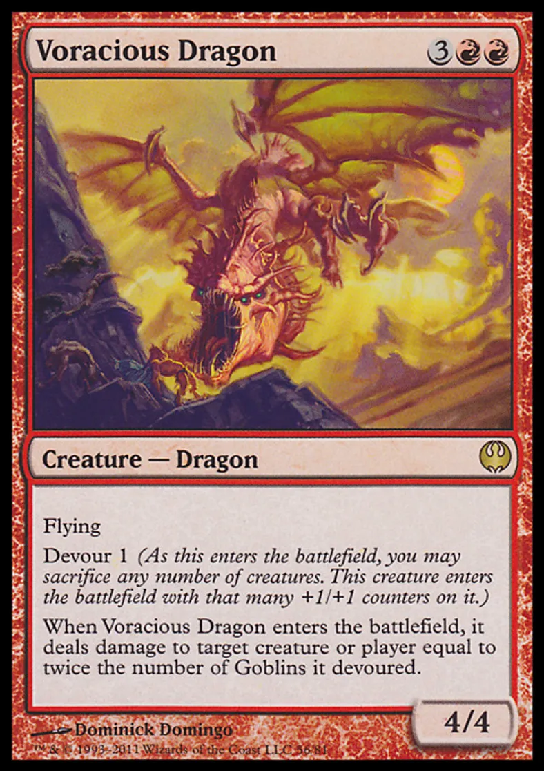 | Oracle Text | Flying Devour 1 (As this enters the battlefield, you may sacrifice any number of creatures. This creature enters the battlefield with that many +1/+1 counters on it.) When Voracious Dragon enters the battlefield, it deals damage to target creature or player equal to twice the number of Goblins it devoured. | ||