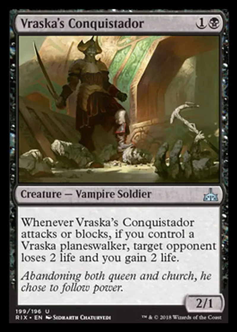 | Oracle Text | Whenever Vraska's Conquistador attacks or blocks, if you control a Vraska planeswalker, target opponent loses 2 life and you gain 2 life. | ||