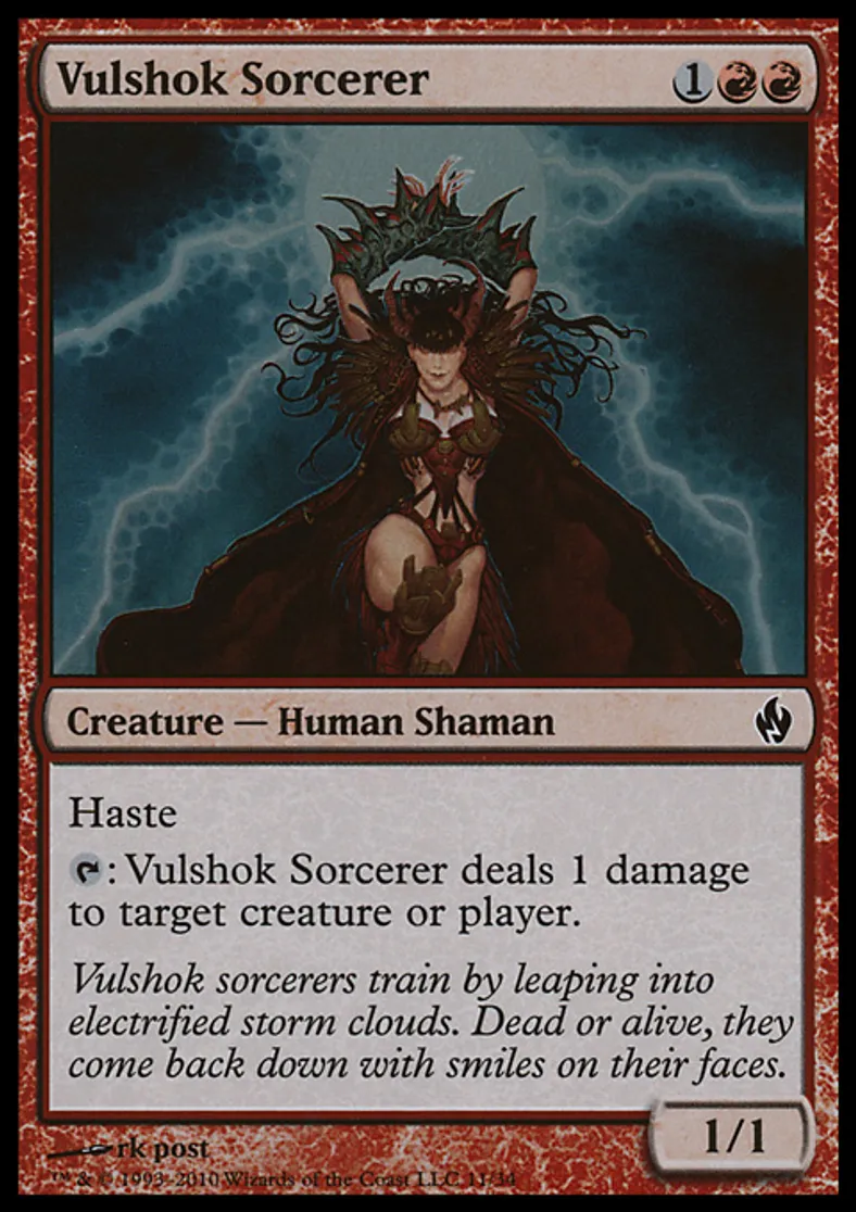 | Oracle Text | Haste {{t}}: Vulshok Sorcerer deals 1 damage to target creature or player. | ||