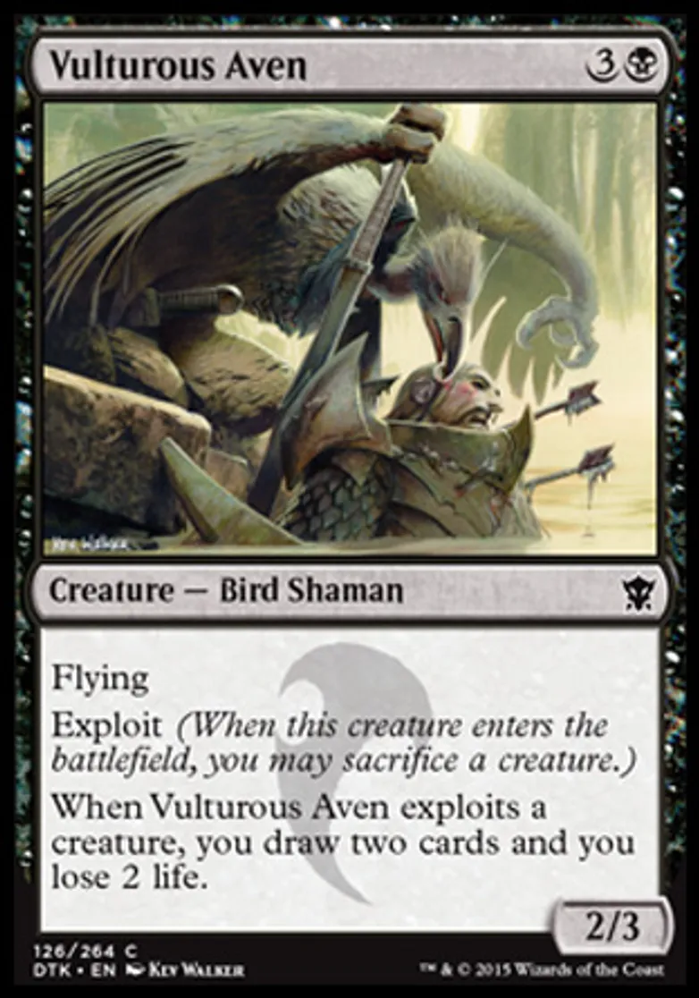 | Oracle Text | Flying Exploit (When this creature enters the battlefield, you may sacrifice a creature.) When Vulturous Aven exploits a creature, you draw two cards and you lose 2 life. | ||