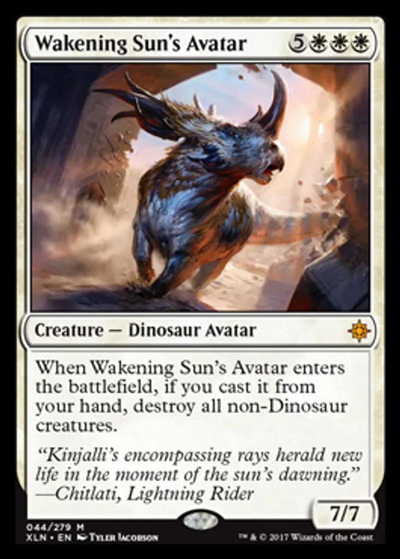 | Oracle Text | When Wakening Sun's Avatar enters the battlefield, if you cast if from you hand, destroy all non-Dinosaur creatures. | ||